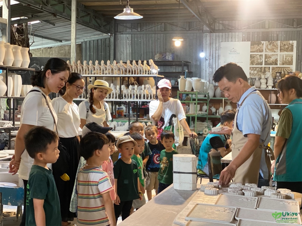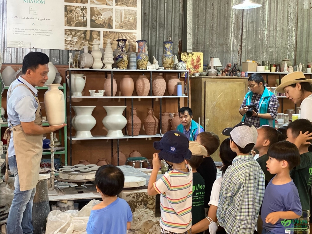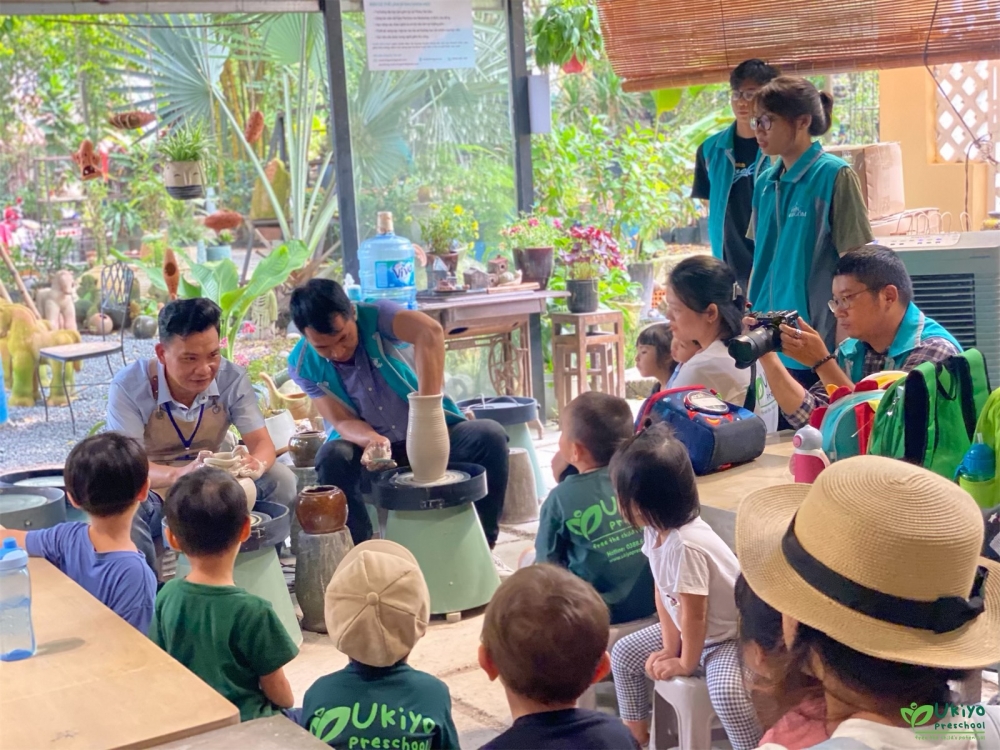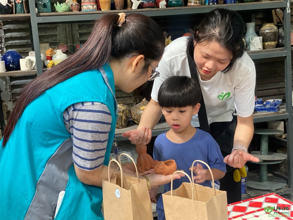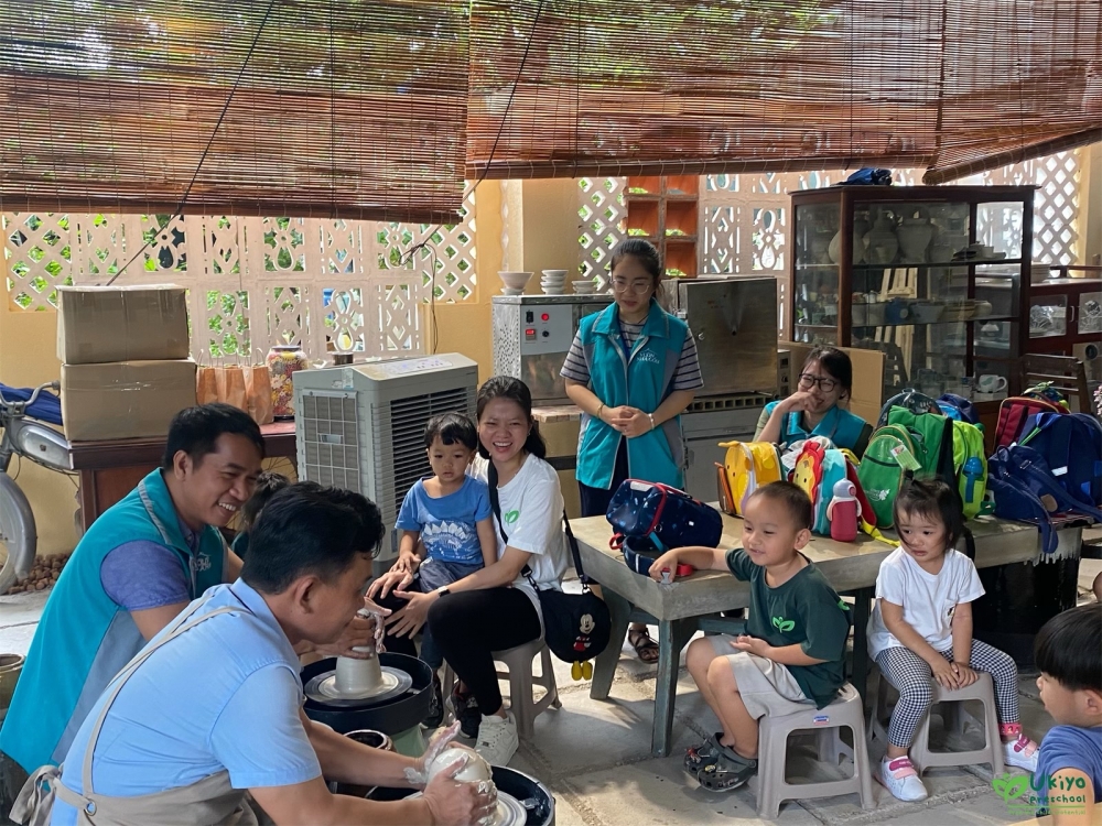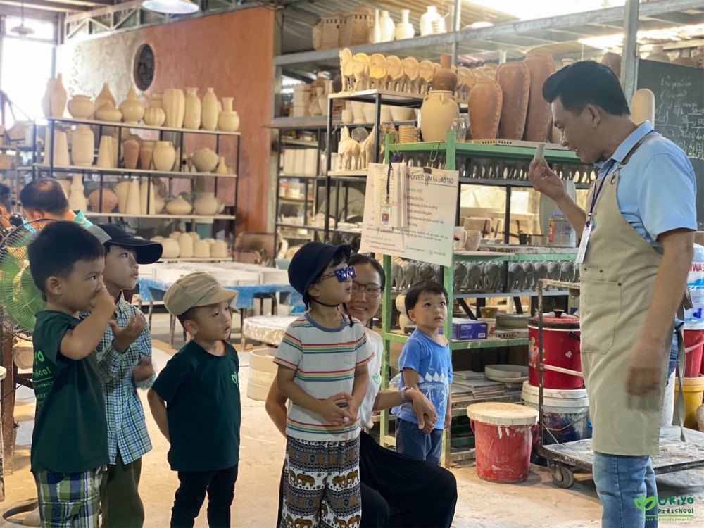 Hơn nữa, làm gốm thủ công không chỉ là một nghề truyền thống cần được gìn giữ mà nó còn là một bộ môn nghệ thuật đặc biệt mang tính thẩm mỹ cao vẫn luôn trường tồn cho đến ngày nay. Đến thăm Vườn, các bạn nhỏ được ngắm rất nhiều sản phẩm gốm nghệ thuật trưng bày khắp nơi, từ chậu hoa, chậu cây cảnh hình con gà, con cừu từ ngoài sân … cho đến các sản phẩm tinh xảo hơn ở khu trưng bày bên trong. Được các nghệ nhân kể nghe “câu chuyện” về gốm thủ công Nam Bộ, quy trình làm ra một sản phẩm gốm, phân biệt giữa gốm thủ công và gốm công nghiệp. Thú vị hơn cả, là được tận mắt xem nghệ nhân xoay bình gốm và trải qua cảm giác hứng thú xen lẫn hồi hộp khi các bạn được tận tay thực hiện, cảm nhận khối đất thay đổi hình dạng ra sao trong đôi tay kì diệu của mình. Các con còn thắc mắc “gốm có làm được ô tô không? Có làm được khủng long không?” Các con được một lần nữa phân biệt sự khác nhau giữa sản phẩm chưa nung và đã nung một cách kĩ càng hơn mặc dù ở trường con đã được học ở giờ làm gốm. Khi các con khẳng định chắc nịch rằng gốm thô đẹp hơn gốm đã phủ men thì các cô hiểu rằng các con cũng có gu thẩm mỹ nhất định, có chính kiến riêng và đó là điều mà các cô luôn cố gắng xây dựng trong quá trình giáo dục trẻ.