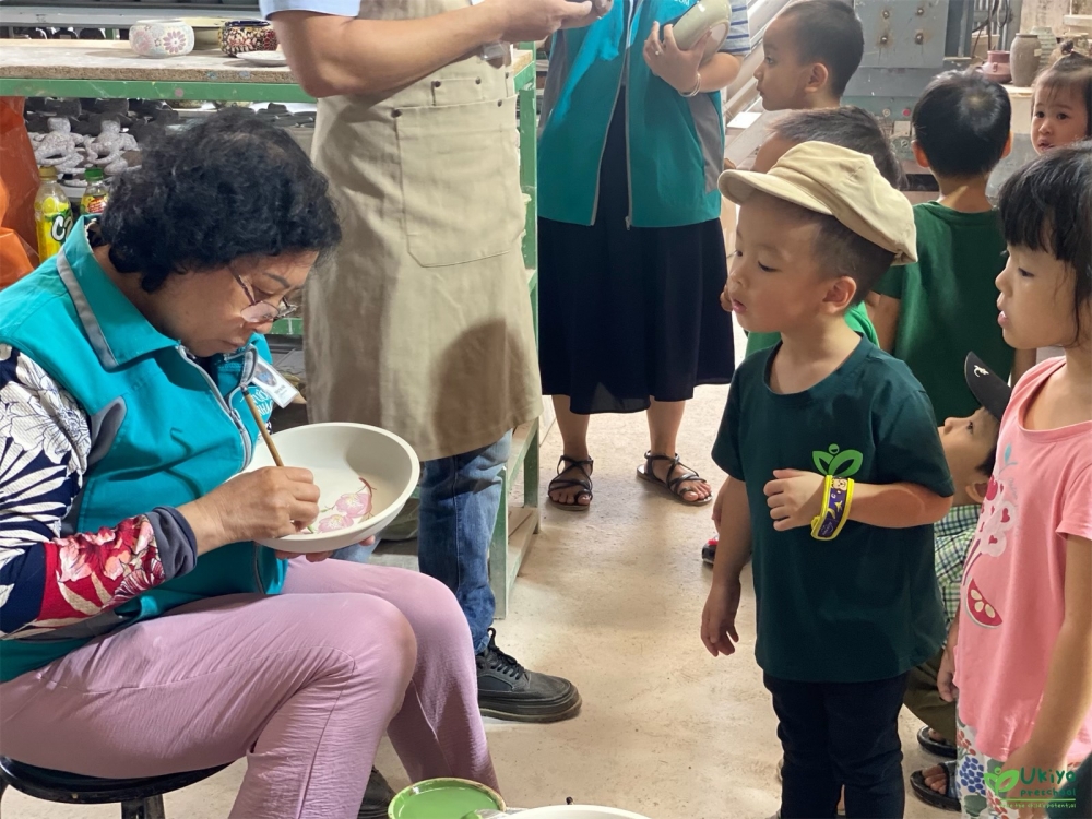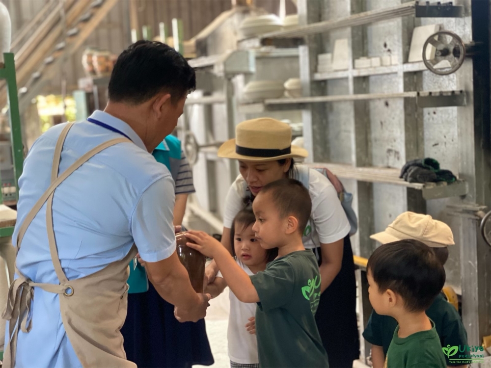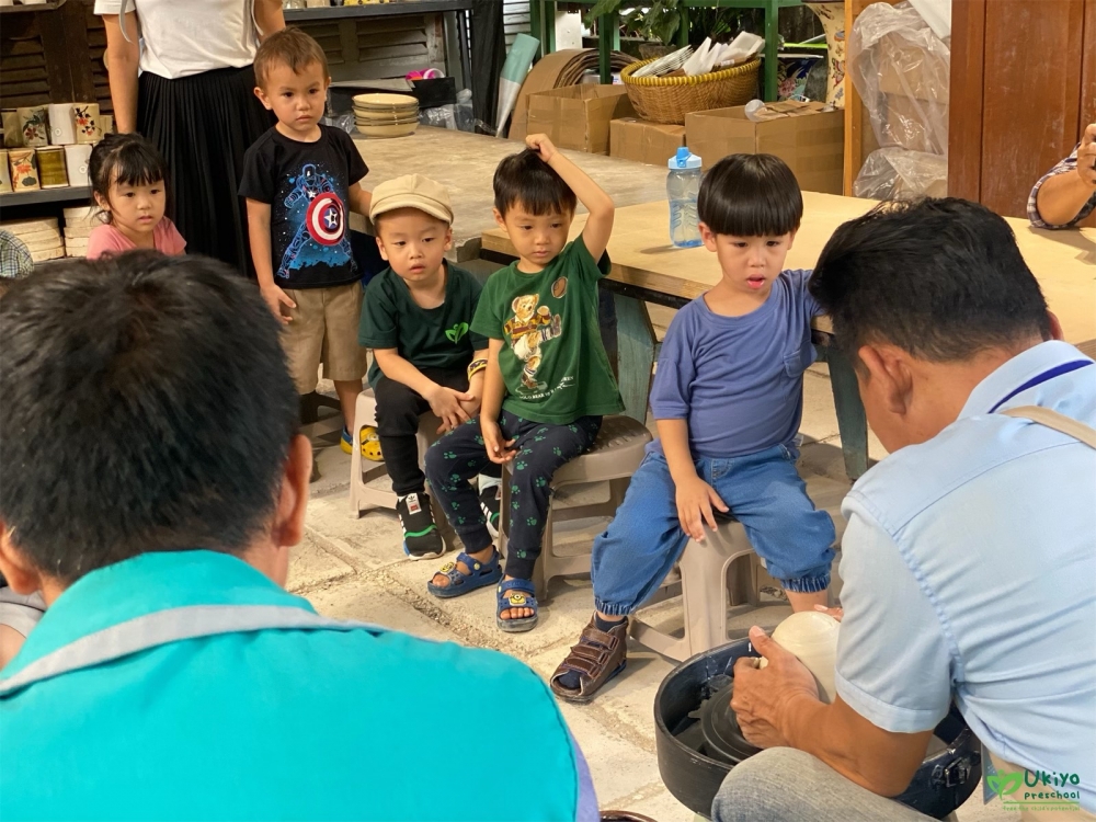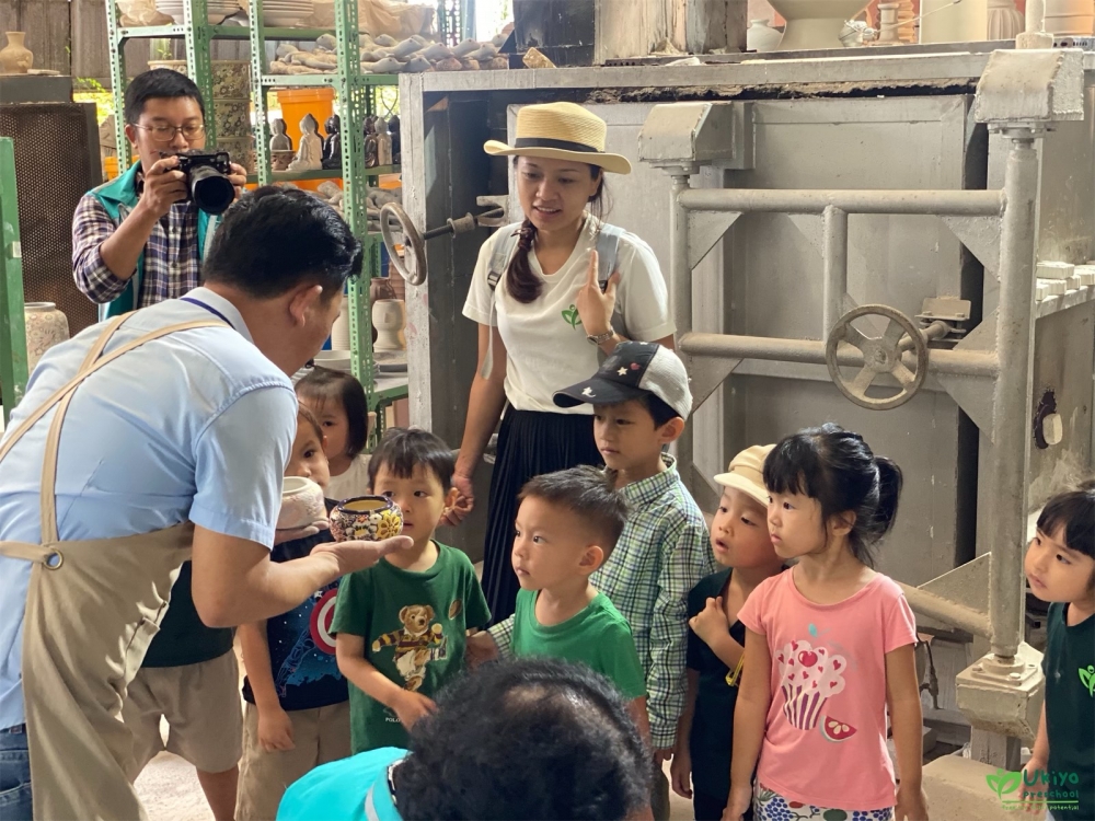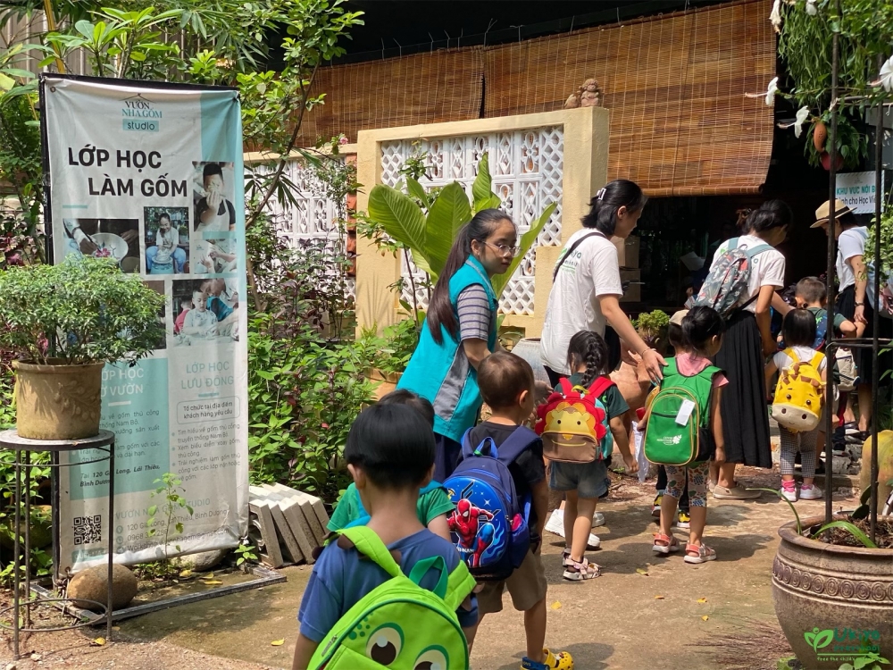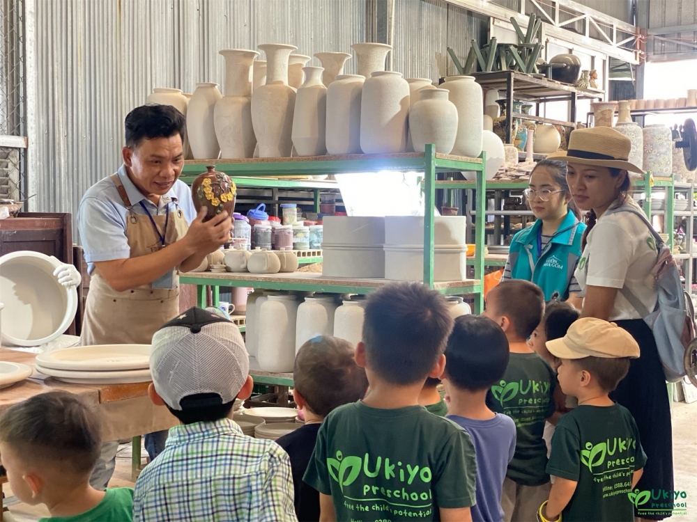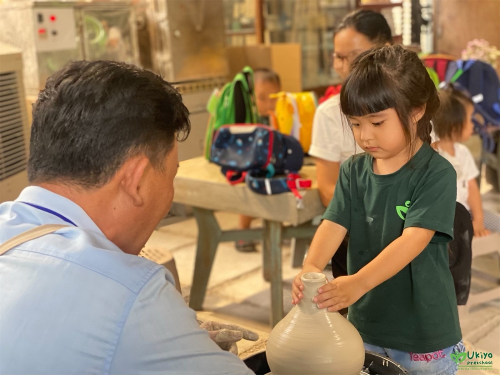 Hơn nữa, làm gốm thủ công không chỉ là một nghề truyền thống cần được gìn giữ mà nó còn là một bộ môn nghệ thuật đặc biệt mang tính thẩm mỹ cao vẫn luôn trường tồn cho đến ngày nay. Đến thăm Vườn, các bạn nhỏ được ngắm rất nhiều sản phẩm gốm nghệ thuật trưng bày khắp nơi, từ chậu hoa, chậu cây cảnh hình con gà, con cừu từ ngoài sân … cho đến các sản phẩm tinh xảo hơn ở khu trưng bày bên trong. Được các nghệ nhân kể nghe “câu chuyện” về gốm thủ công Nam Bộ, quy trình làm ra một sản phẩm gốm, phân biệt giữa gốm thủ công và gốm công nghiệp. Thú vị hơn cả, là được tận mắt xem nghệ nhân xoay bình gốm và trải qua cảm giác hứng thú xen lẫn hồi hộp khi các bạn được tận tay thực hiện, cảm nhận khối đất thay đổi hình dạng ra sao trong đôi tay kì diệu của mình. Các con còn thắc mắc “gốm có làm được ô tô không? Có làm được khủng long không?” Các con được một lần nữa phân biệt sự khác nhau giữa sản phẩm chưa nung và đã nung một cách kĩ càng hơn mặc dù ở trường con đã được học ở giờ làm gốm. Khi các con khẳng định chắc nịch rằng gốm thô đẹp hơn gốm đã phủ men thì các cô hiểu rằng các con cũng có gu thẩm mỹ nhất định, có chính kiến riêng và đó là điều mà các cô luôn cố gắng xây dựng trong quá trình giáo dục trẻ.