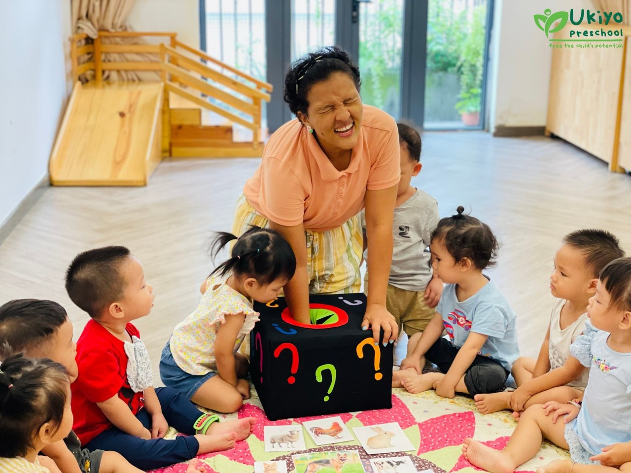Tại Ukiyo, môi trường song ngữ được xây dựng để trẻ có thể tiếp xúc, thực hành và hấp thu cả tiếng Anh và Việt một cách hoàn toàn tự nhiên mà không cần nỗ lực. Người lớn trong môi trường chỉ cần đảm bảo nguyên tắc nhất quán: Một người lớn – Một ngôn ngữ để tránh gây xáo trộn tư duy trẻ và giữ vai trò là hình mẫu để trẻ có thể học hỏi.